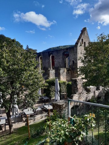 Nachmittags hatten wir eine Kaffeetafel im Weingut „Kloster Marienthal“. Das Kloster Marienthal ist ein ehemaliges Augustinerinnenkloster in Marienthal, einem Ortsteil von Dernau in Rheinland-Pfalz. Es wurde 1137 gegründet und ist das älteste Kloster des Ahrtals. Ab 1952 war es eine Staatliche Weinbaudomäne des Landes Rheinland-Pfalz und der Staatlichen Lehr- und Versuchsanstalt in Ahrweiler angeschlossen. 2004 verkaufte das Land das Anwesen und die Weinberge an vier Winzerunternehmen aus der Region, die gemeinsam das Weingut Kloster Marienthal mit 4,5 Hektar Rebflächen betreiben. Nach Kaffee, Tee und Kuchen blieb noch Zeit, die herrliche Landschaft zu genießen. Entweder bei einem Spaziergang oder bei einem Glas Weinschorle in der Außengastronomie in den Ruinen des ehemaligen Klosters.